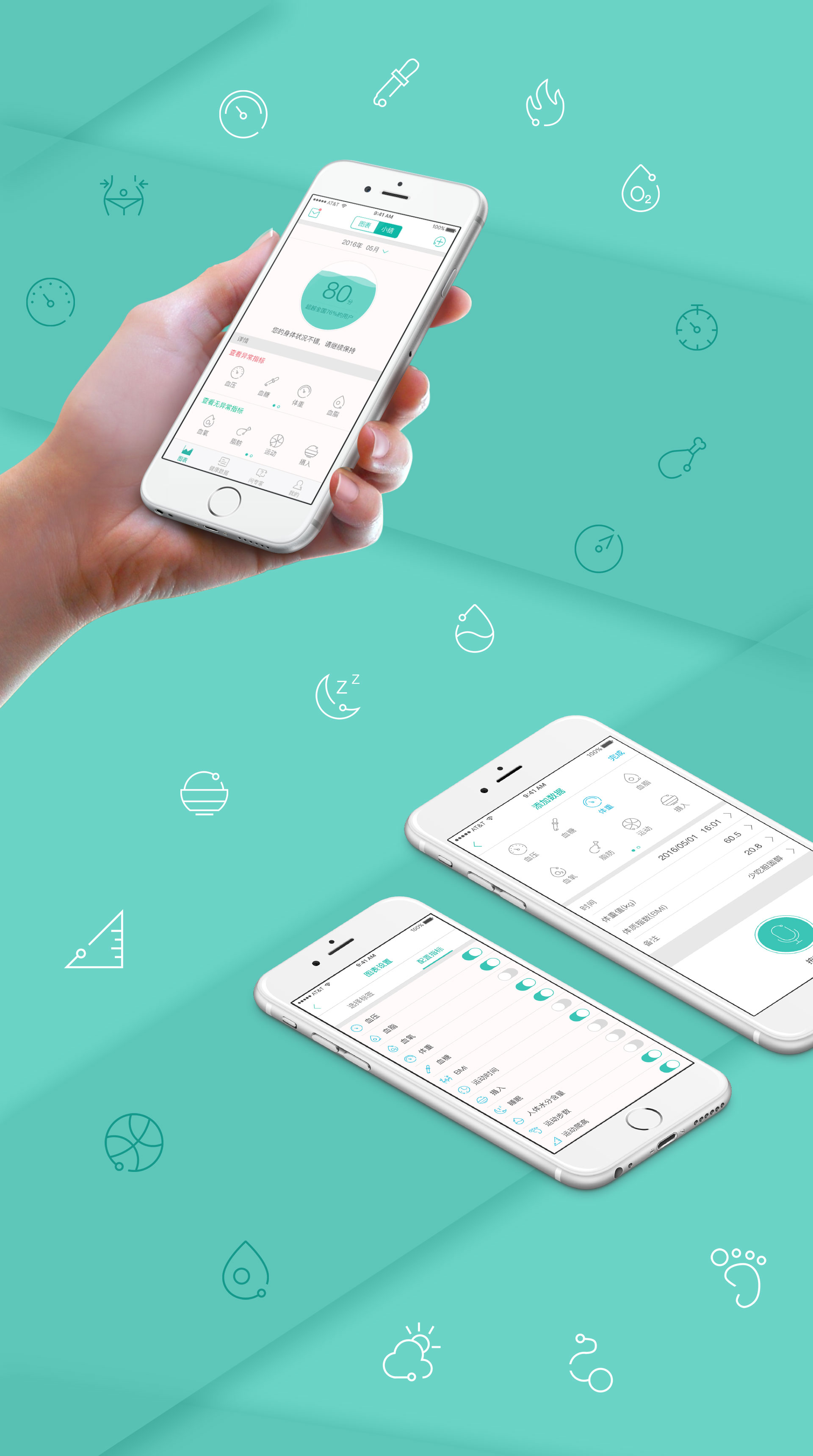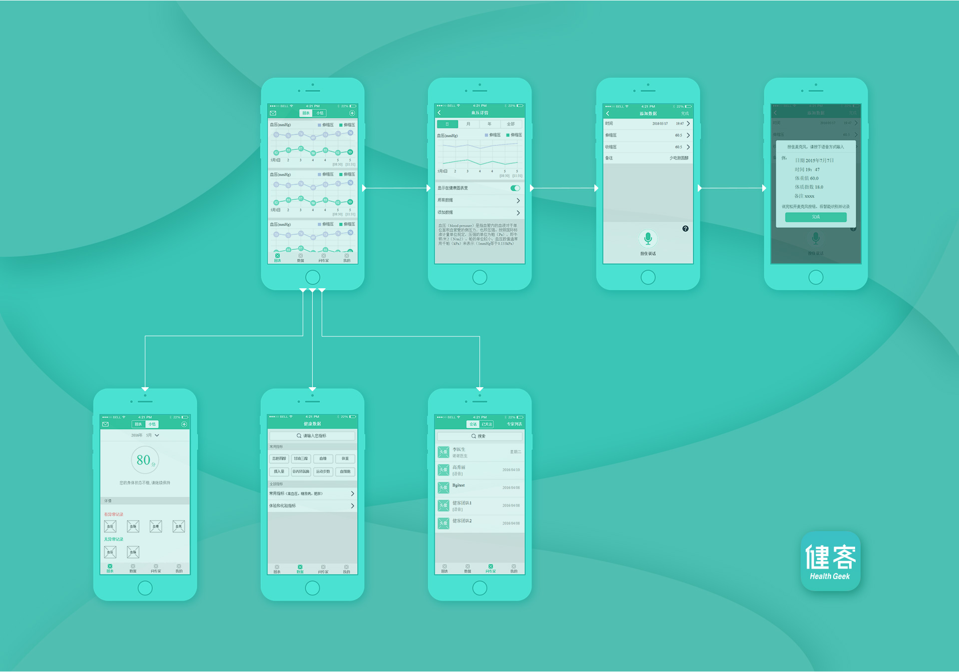 健客2.0APP核心用(yòng)户是中(zhōng)老年人,通过用(yòng)户生理(lǐ)和心理(lǐ)角度进行严谨的配色,考虑用(yòng)户老花(huā)眼、白内障等问题,并按不同年龄段进行分(fēn)析,最终确定两种温和、舒适的颜色进行搭配:绿色 充满生机,能(néng)起到镇静的作(zuò)用(yòng),能(néng)舒缓中(zhōng)老年人疲劳的脑神经和视觉神经;蓝色 具(jù)有(yǒu)海洋、天空遐想,很(hěn)强的稳定性,让中(zhōng)老年人对不良因素的敏感减轻。