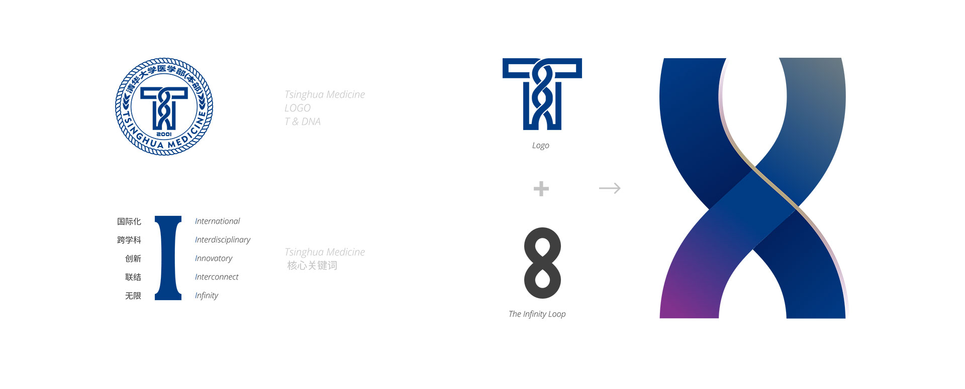 提取清华大學(xué)医(yī)學(xué)院全新(xīn)标志(zhì)中(zhōng)的视觉元素“DNA”双螺旋结构,结合核心关键词5个I,将其中(zhōng)“Infinity”的无限概念具(jù)像化,与LOGO元素融合,體(tǐ)现清华大學(xué)医(yī)學(xué)院专注医(yī)學(xué)领域,无限追求更高的教育、科(kē)研、医(yī)疗水平的追求和使命。