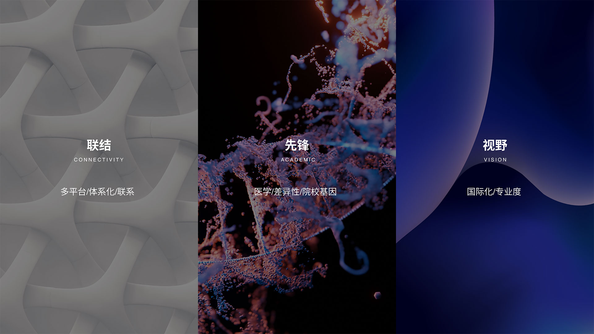 从DNA结构与清华大學(xué)医(yī)學(xué)院希望传达的“专业”、“理(lǐ)性”、“人文(wén)关怀”发散,寻找能(néng)够传递给用(yòng)户相同感觉的图片,提炼可(kě)表达的元素。